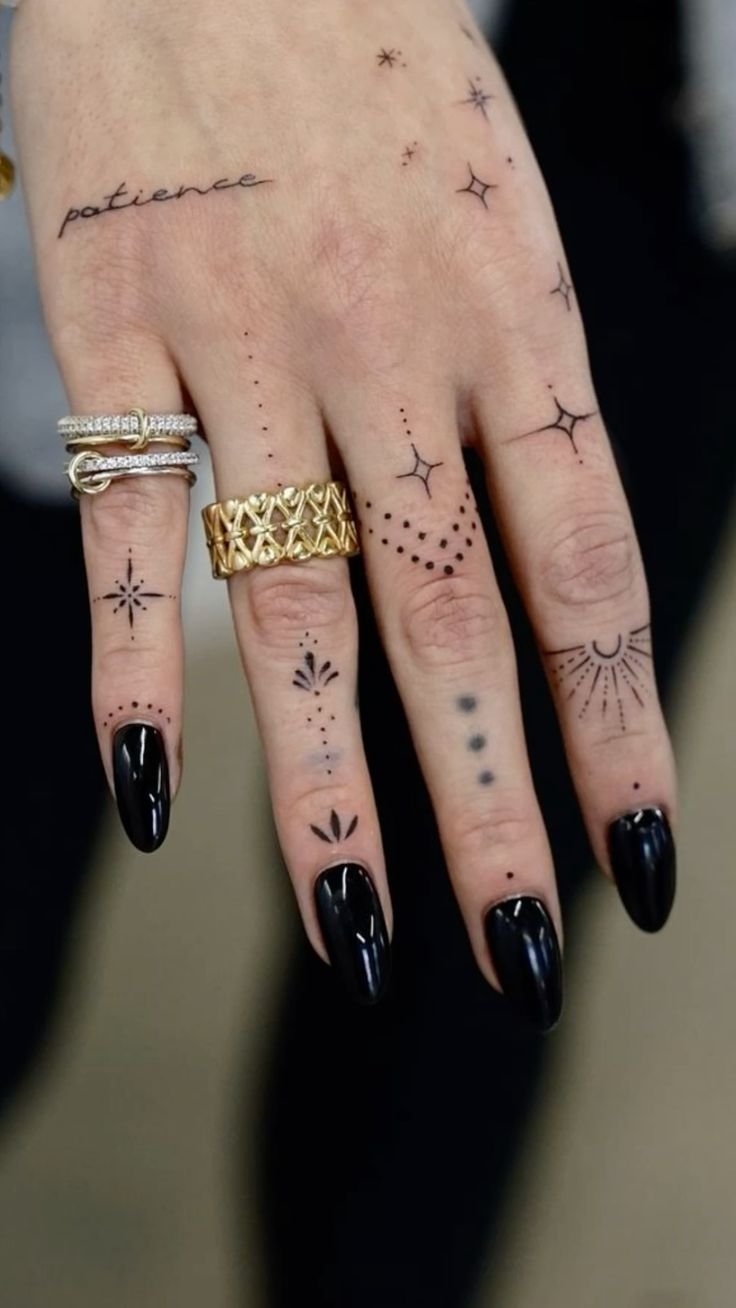 - Symbols. Small symbols like hearts, stars, moons, or suns often adorn women's fingers. These tattoos usually carry personal significance, related to specific events or people.
