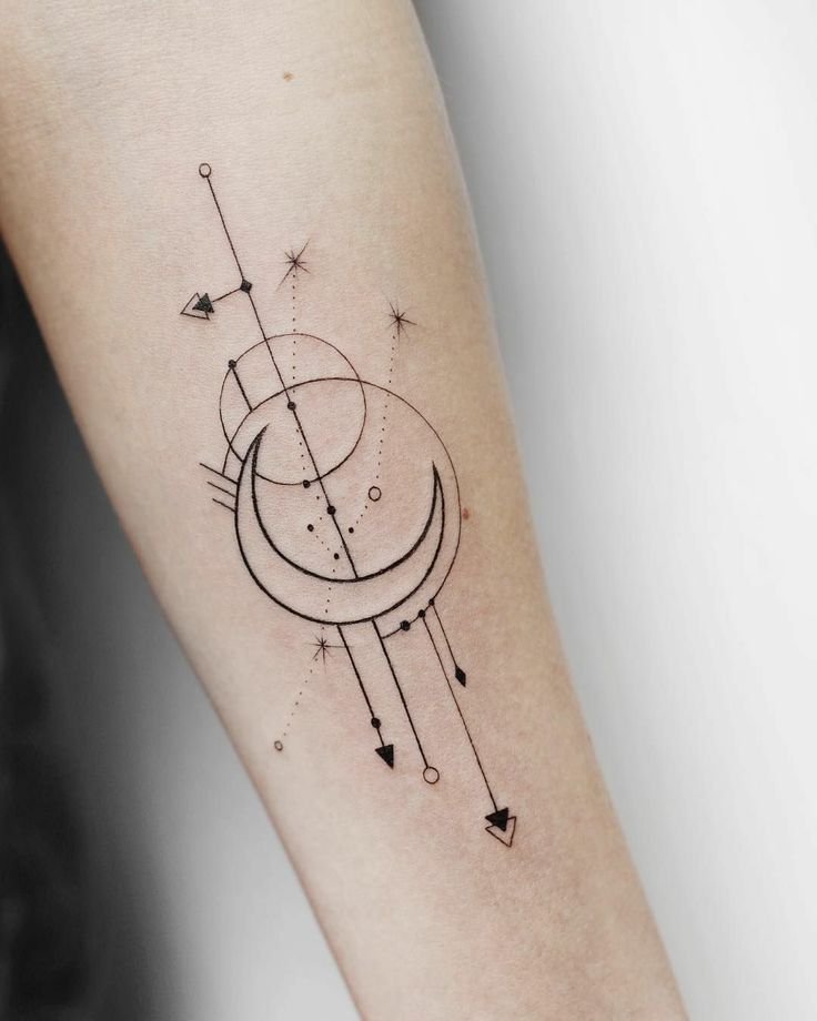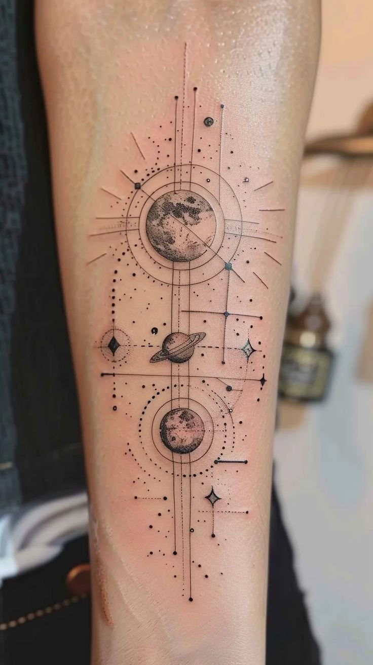 - Cosmic Tattoos: A geometric galaxy or moon with dots and stars symbolizes the mystery of the universe.