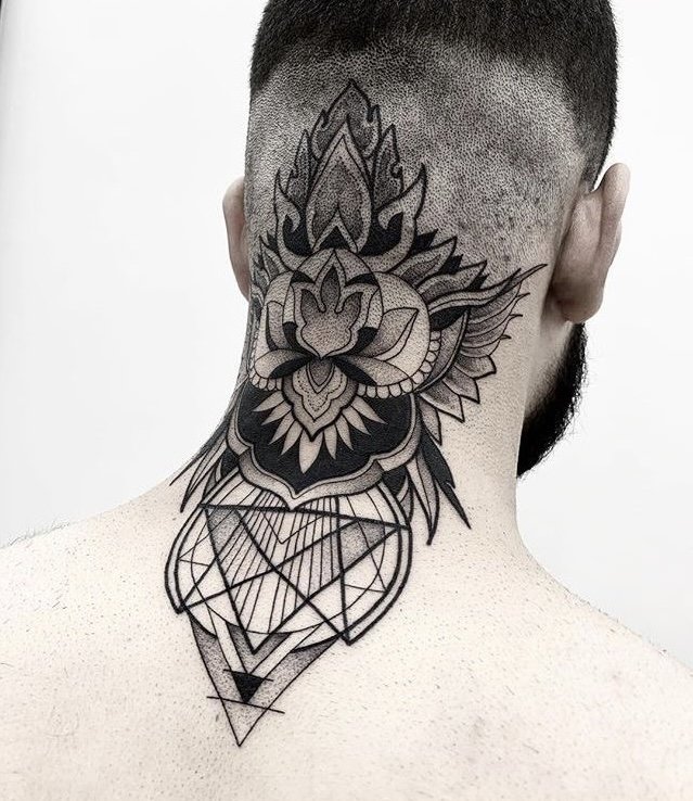 - Geometric tattoos attract with their symmetry and precision of lines, creating striking visual compositions on the skin. They can symbolize balance, eternity, and order. Geometric patterns on the neck can be both simple and complex, depending on the desired effect.