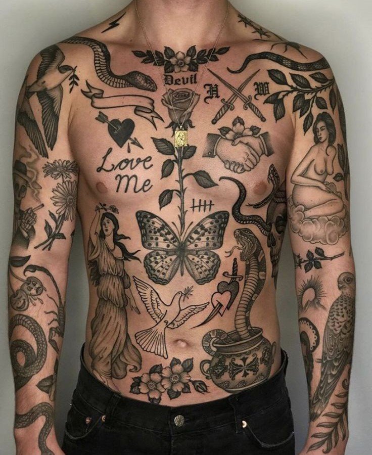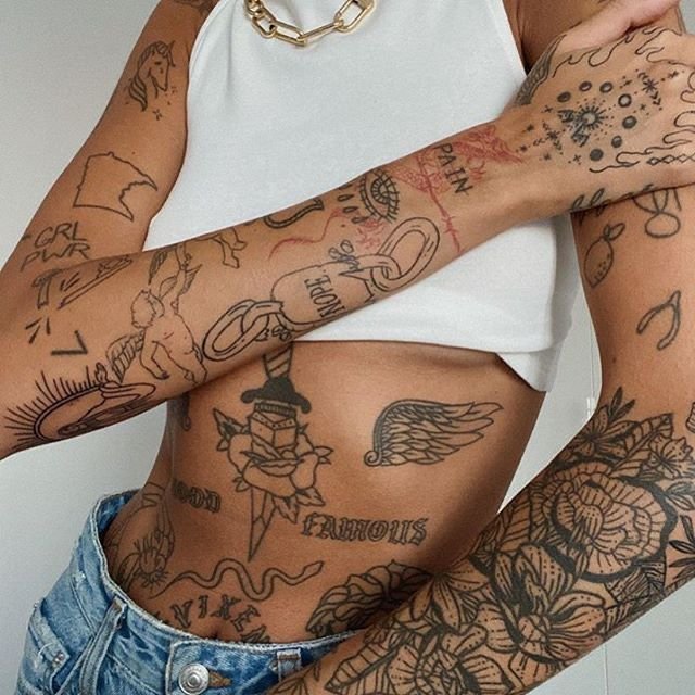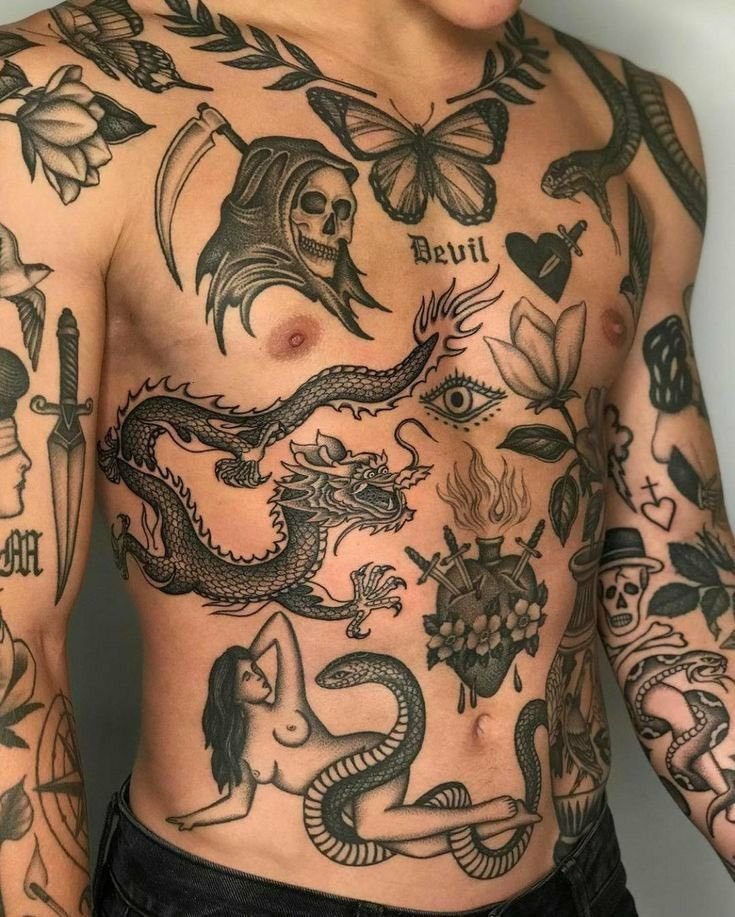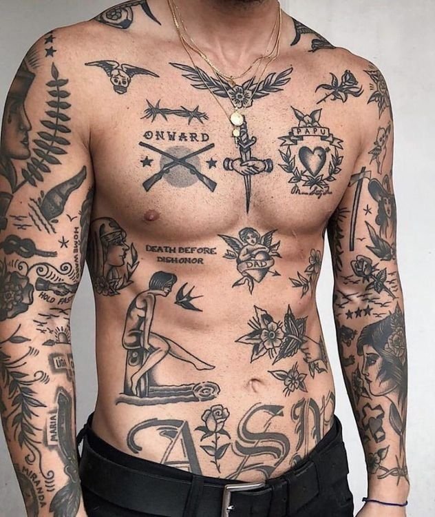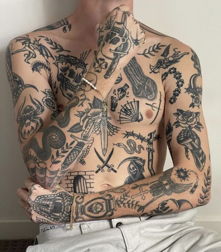 This style is often associated with a certain aesthetic and practice, where tattoos become personal historical fragments, each one adding its own piece to the larger picture of a person's life. It can also be connected to symbolic or emotional experiences of the tattoo owner, where each element holds deep meaning.