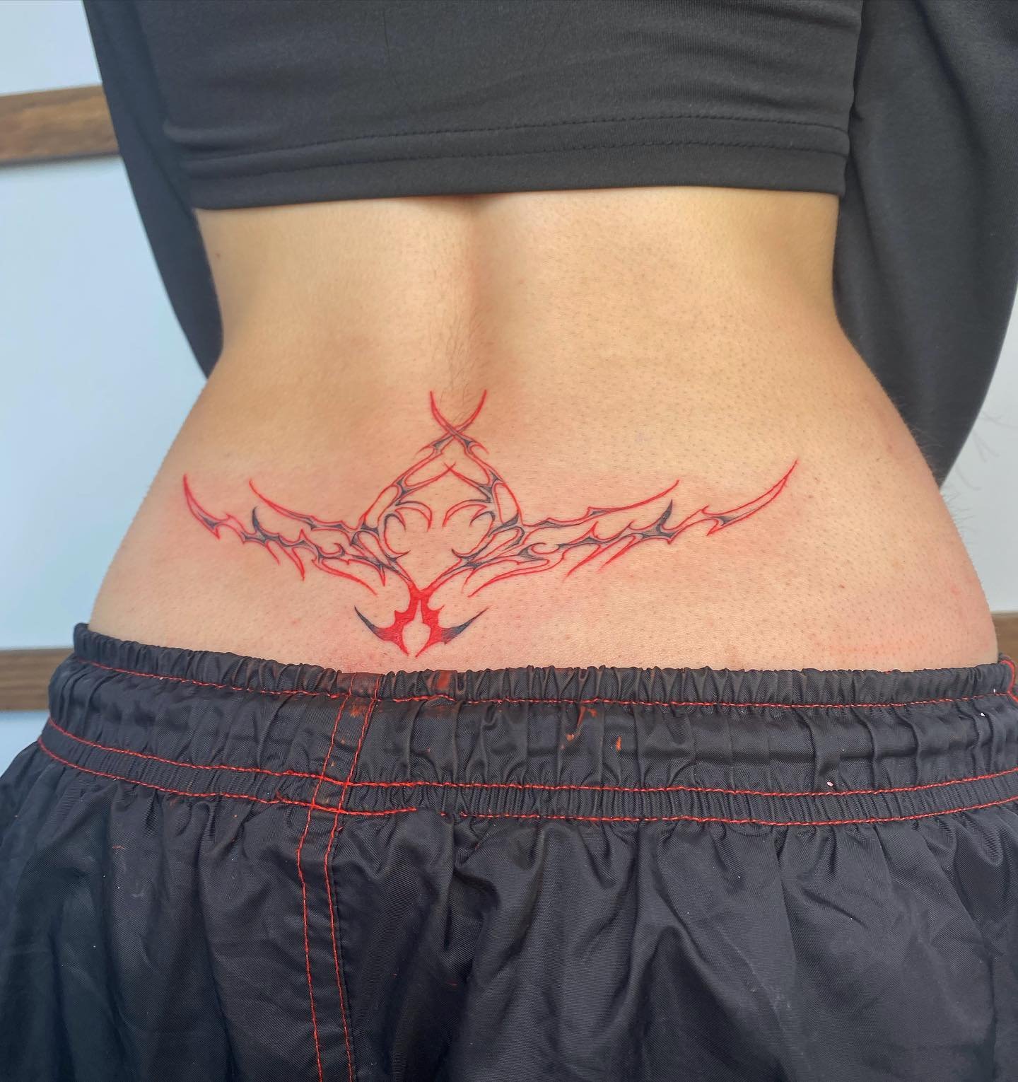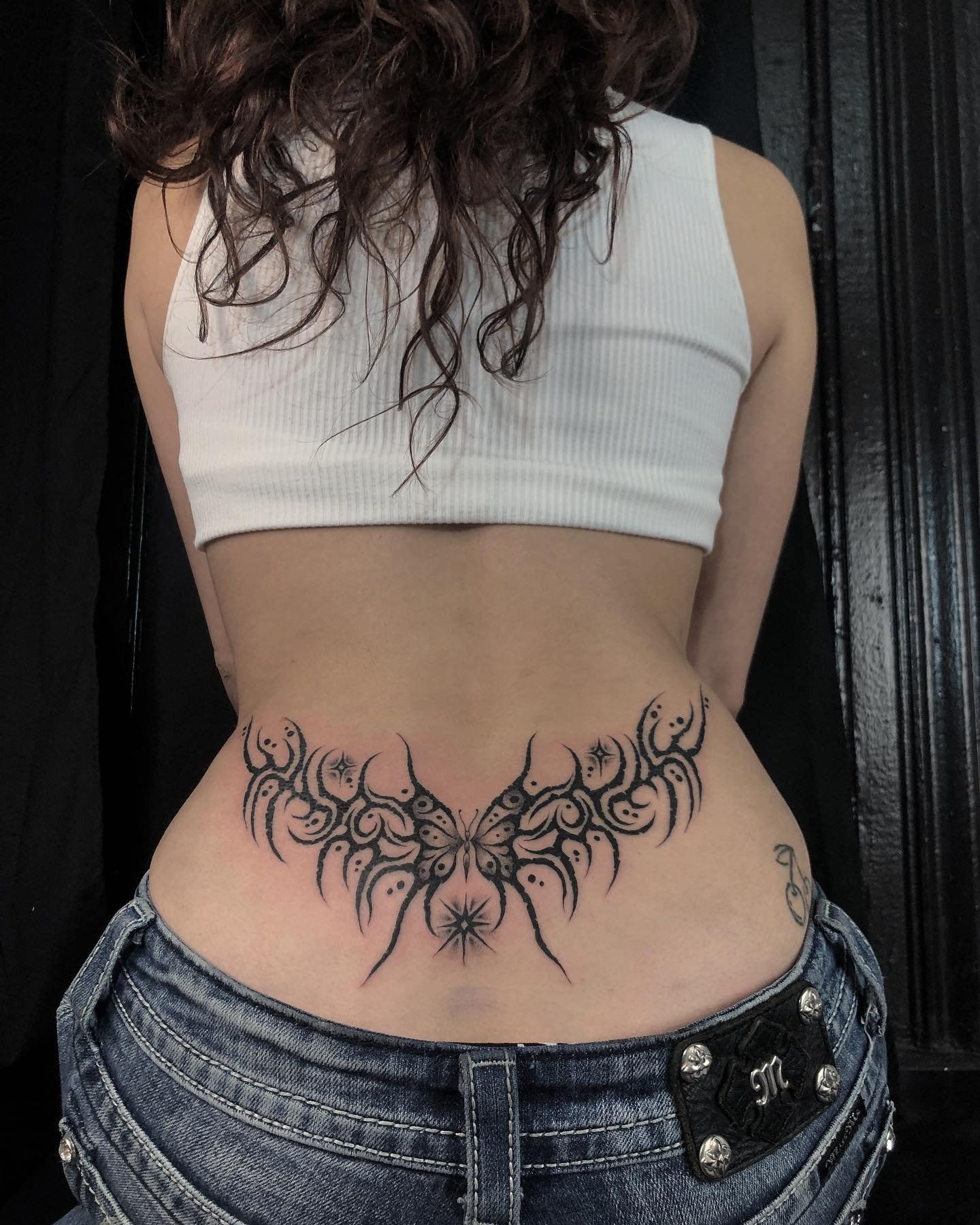 A tramp stamp tattoo refers to a design placed on the lower back, just above the waistline.