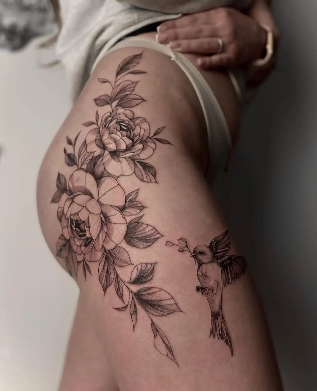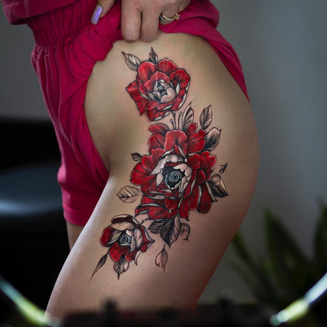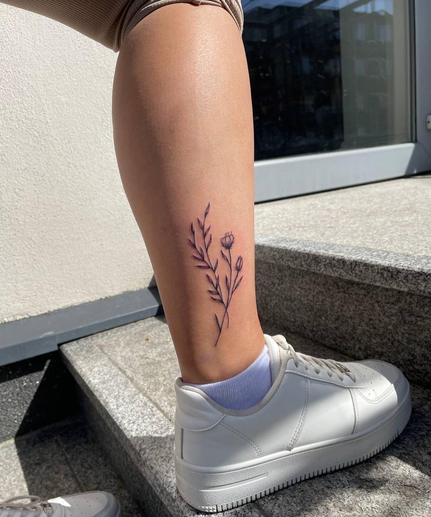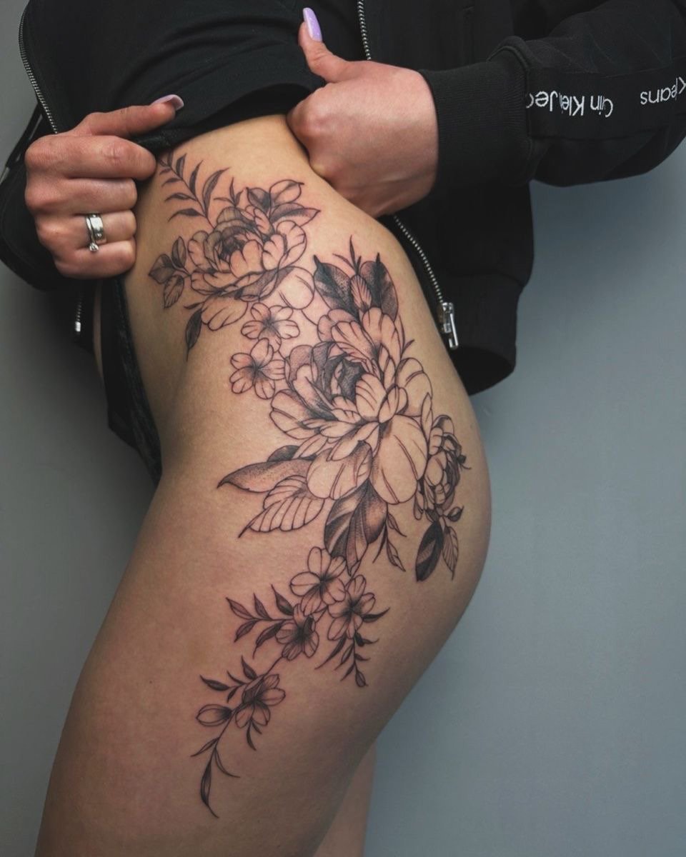 - Floral tattoos on the legs, especially on the thighs or calves, can look very beautiful and feminine. These can be individual flowers or entire bouquets.