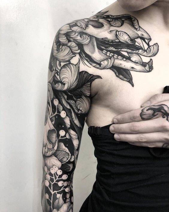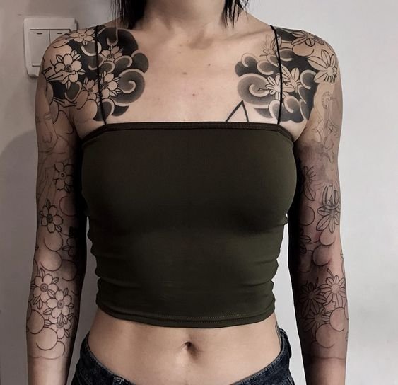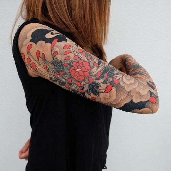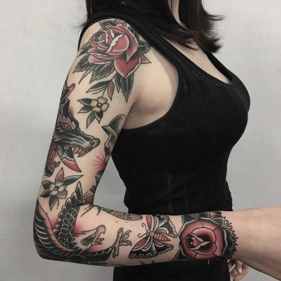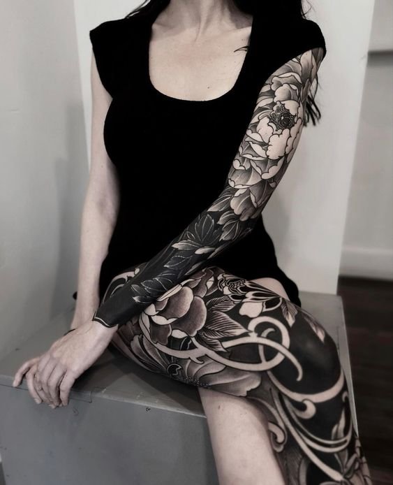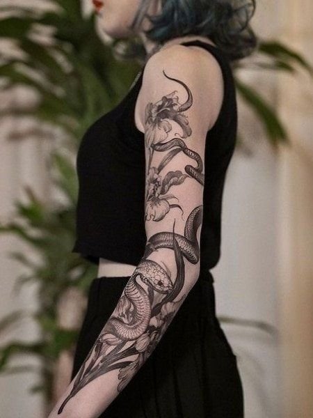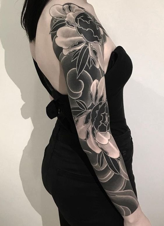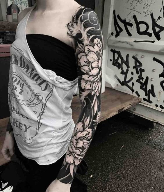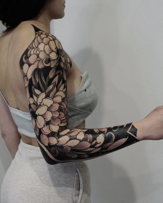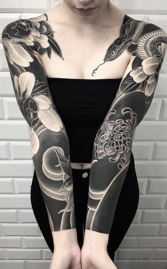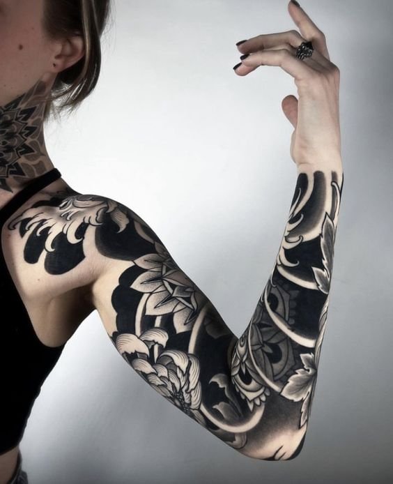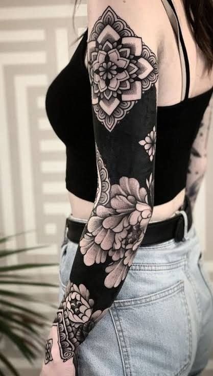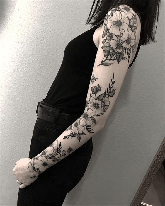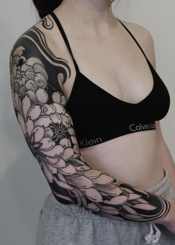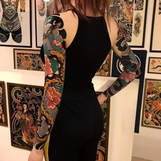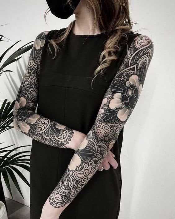 A women's tattoo sleeve is a type of body art that covers a large part of the arm, from the shoulder to the wrist, and features extensive and intricate imagery.