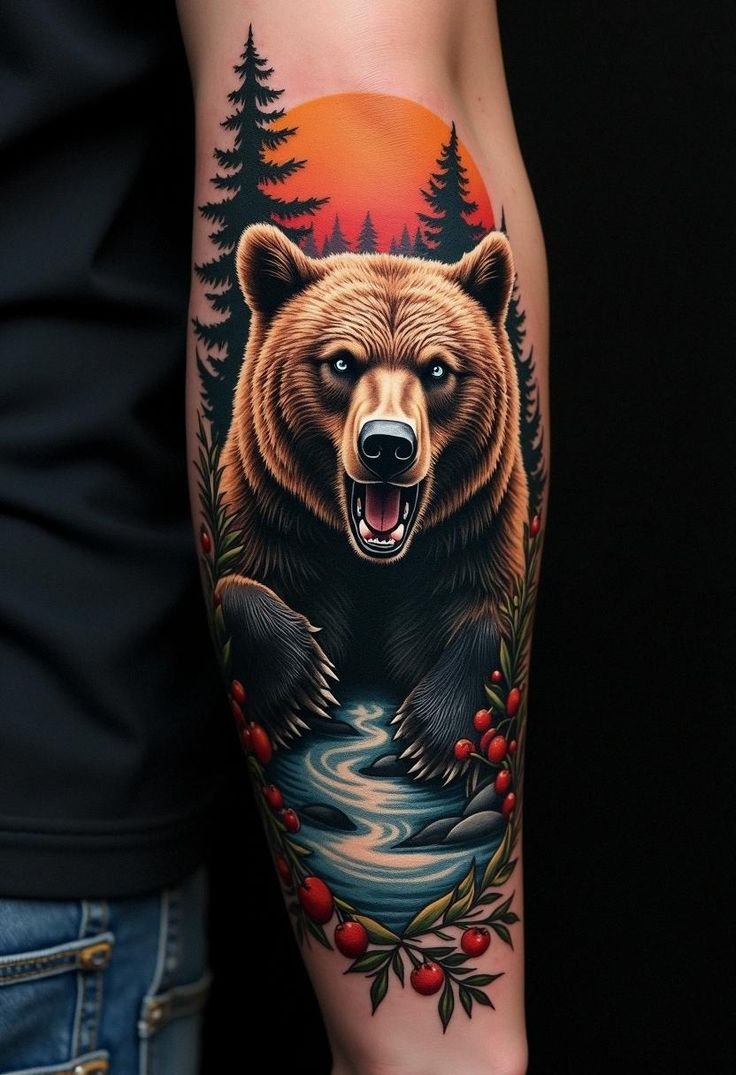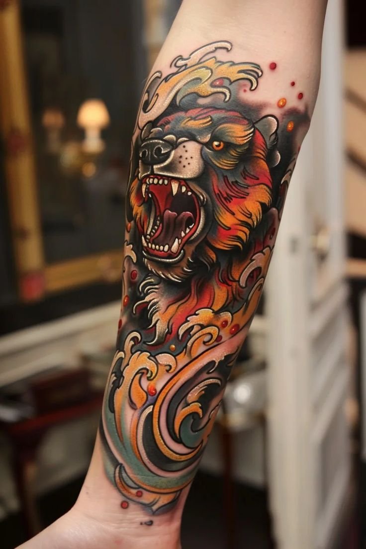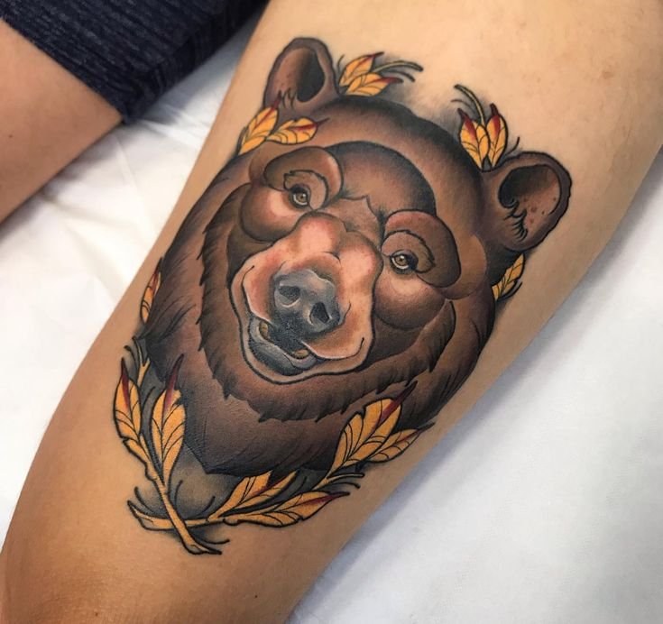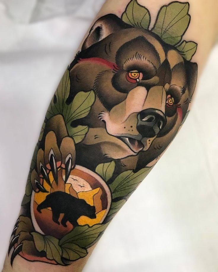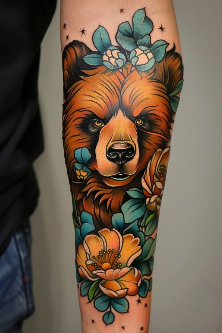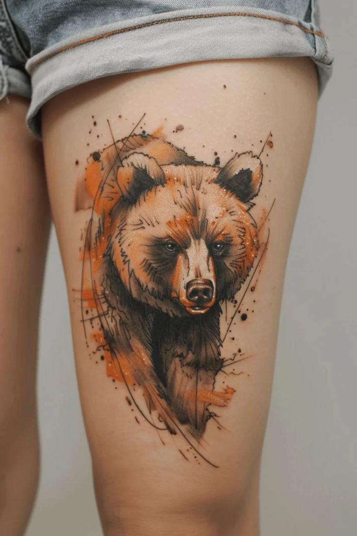 - Bright Colored Bear: For those who love bold accents, a bear tattoo in a watercolor style with bright colors and smooth gradients would be a perfect choice.