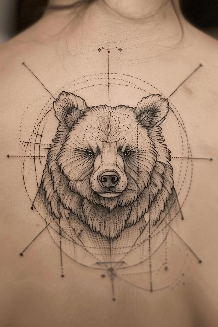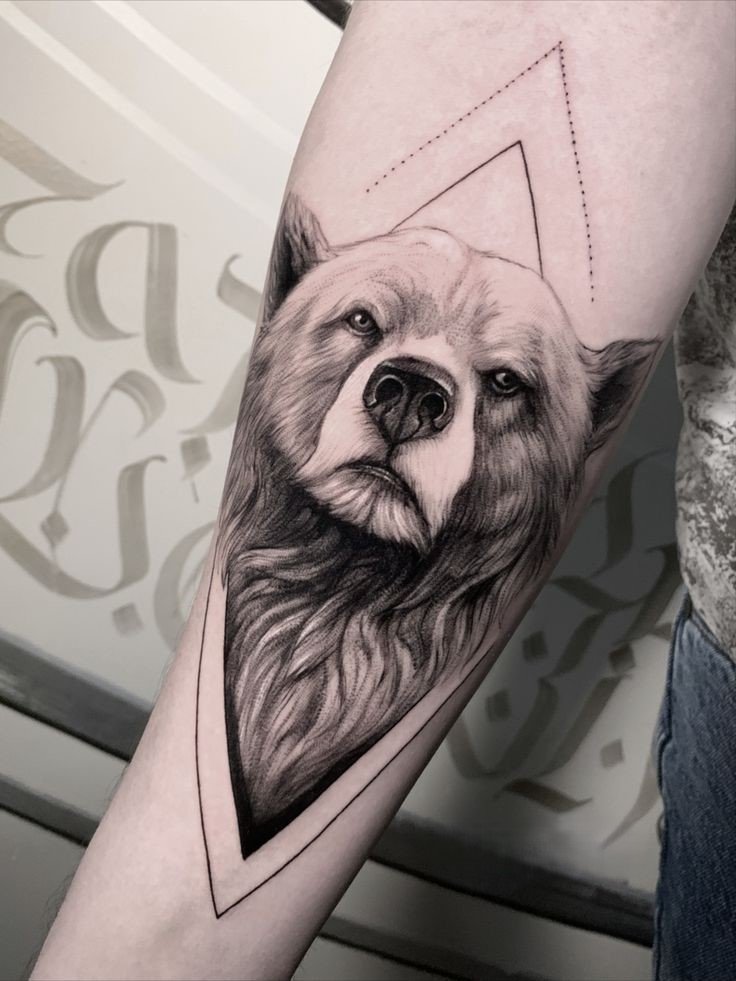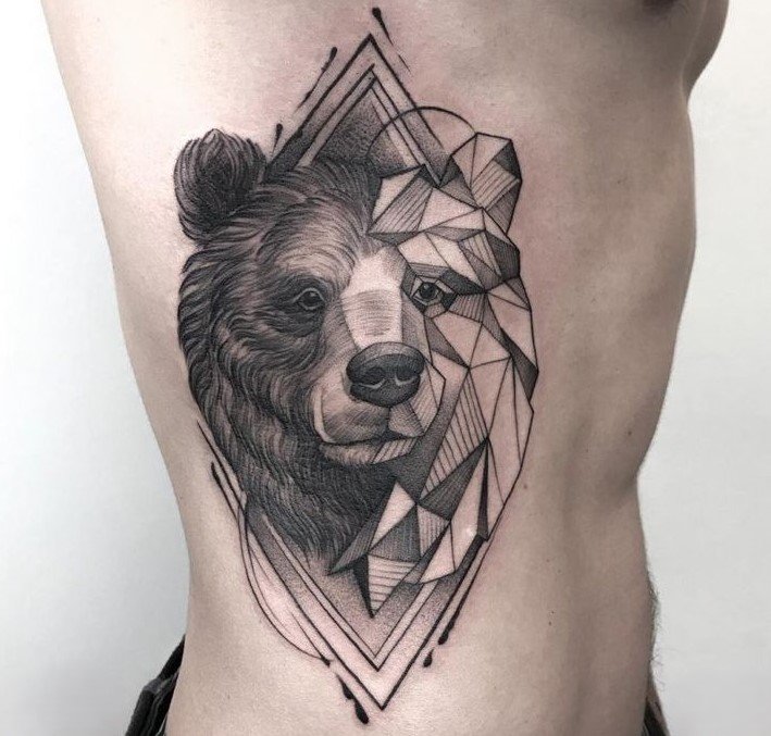 - Geometric Bear Tattoo: Geometric bear tattoos are popular among fans of modern art. In these designs, the silhouette of the bear is made up of geometric shapes and lines, giving the design a unique and stylish look.