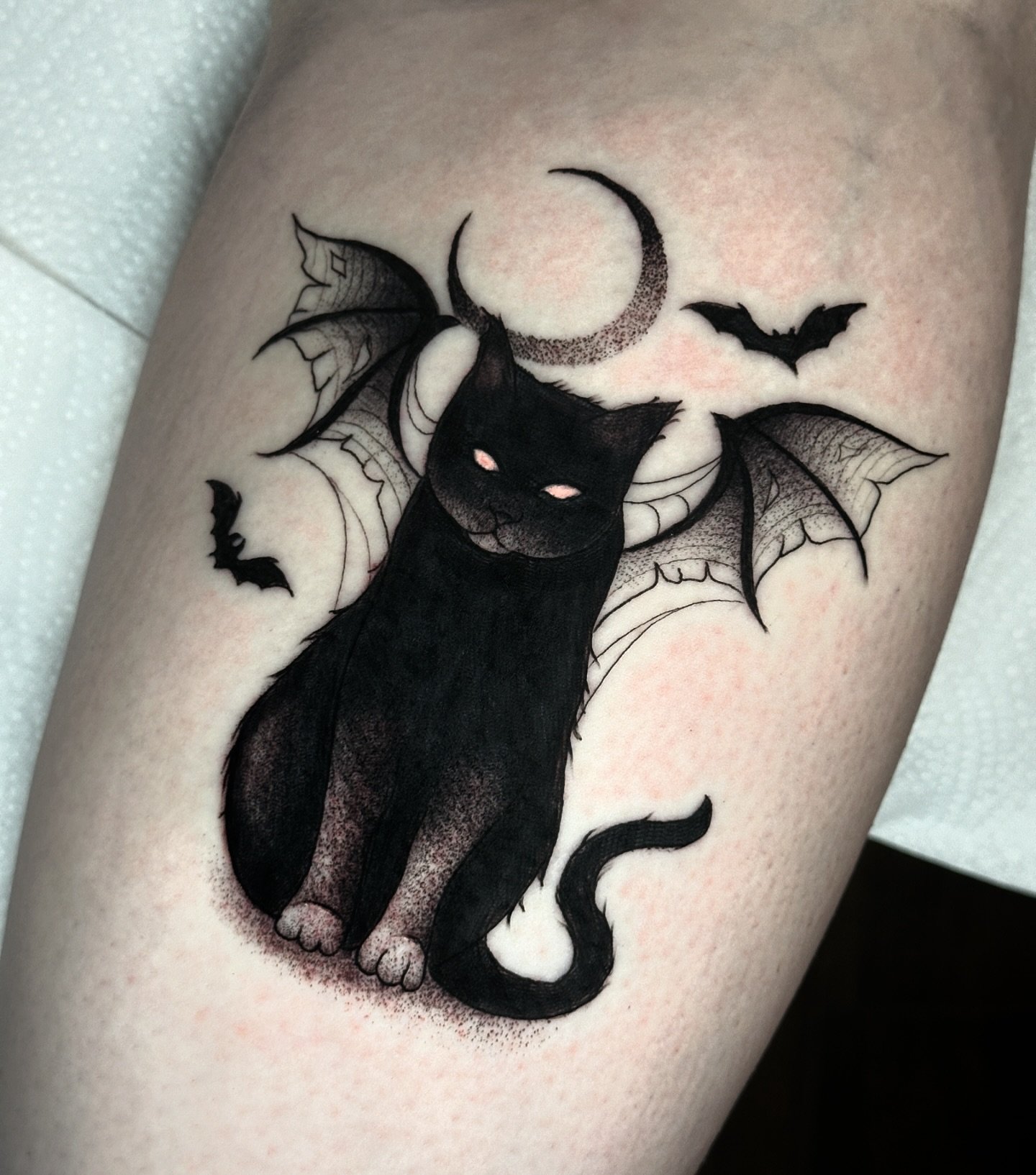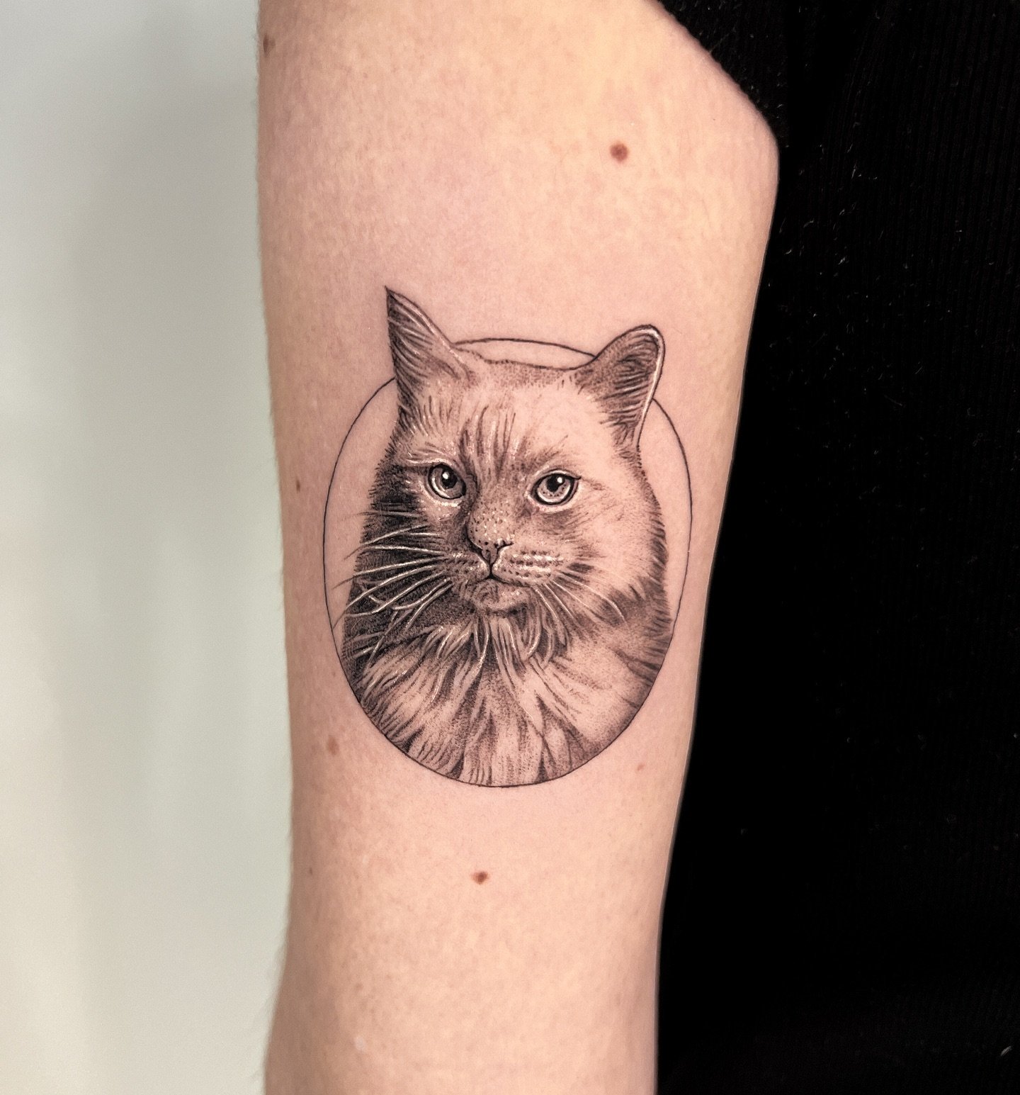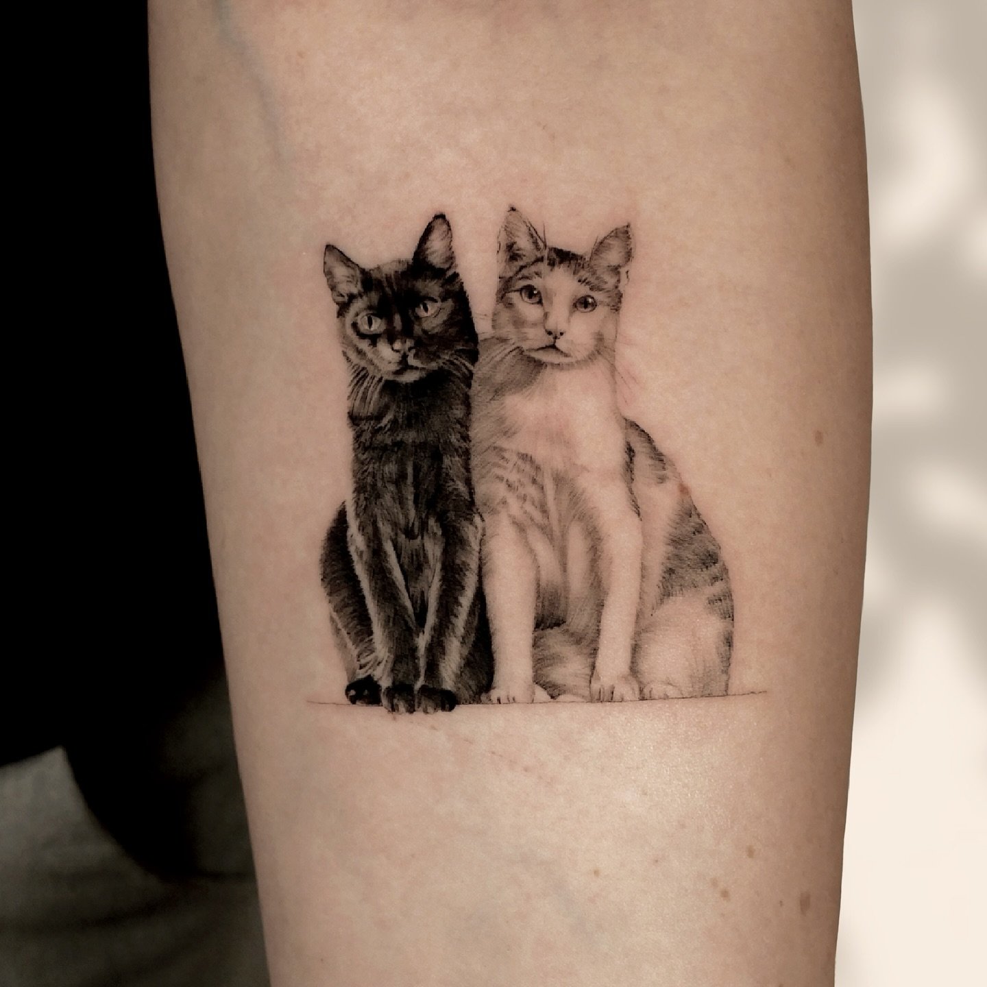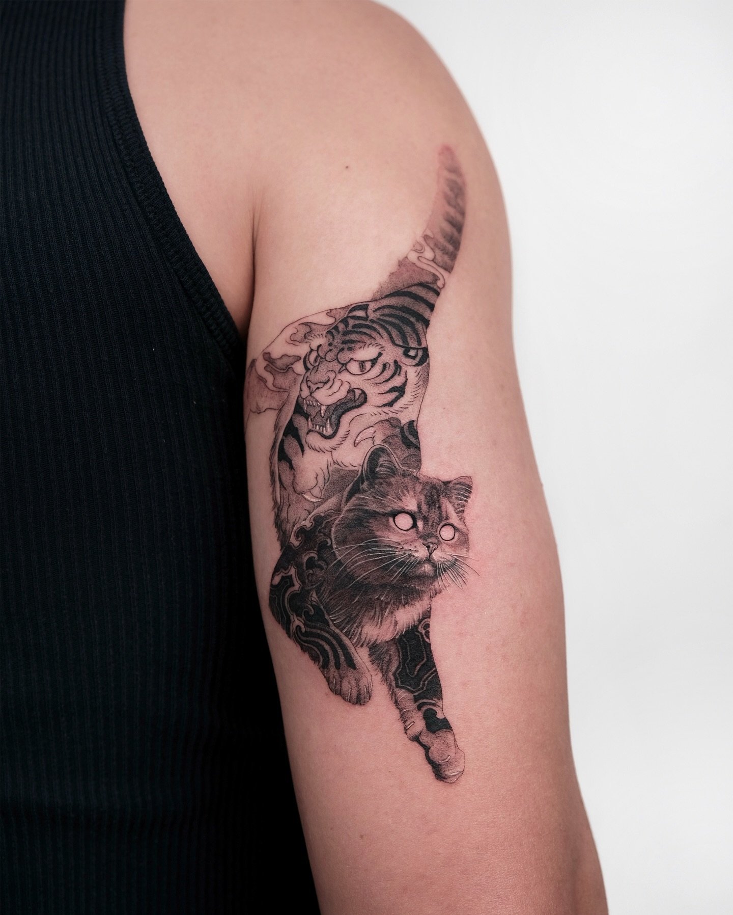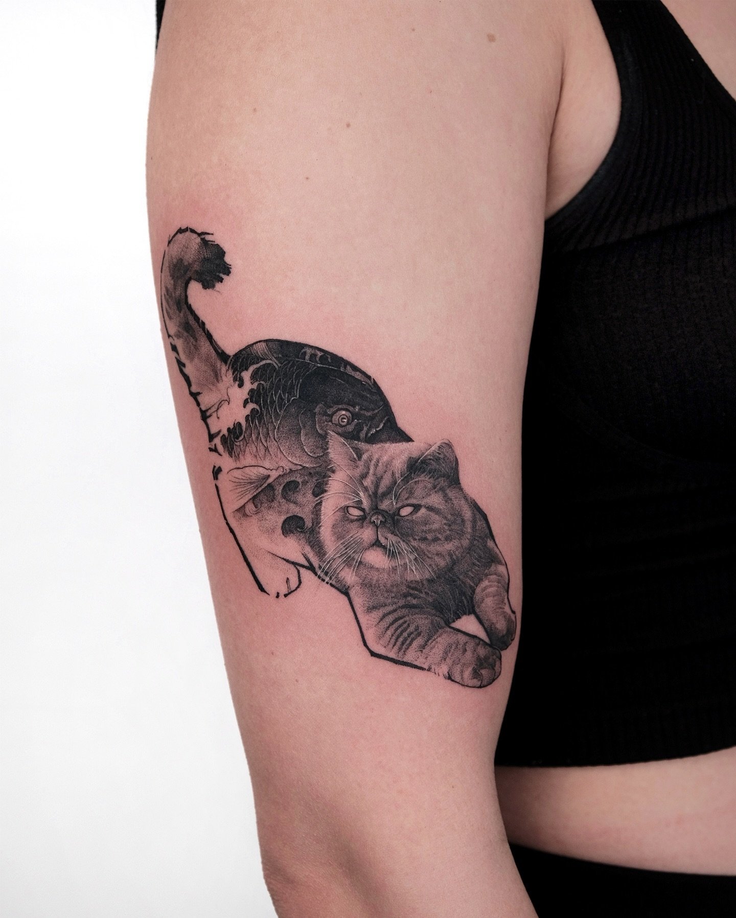 - Graphics and Linework: Black and white graphic tattoos, made with thin lines and dots, give the cat an elegant and refined appearance. This style focuses on details and contours.