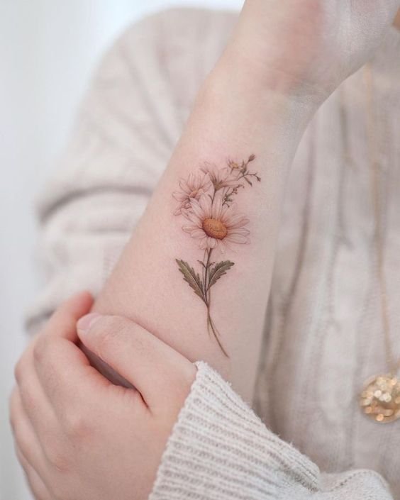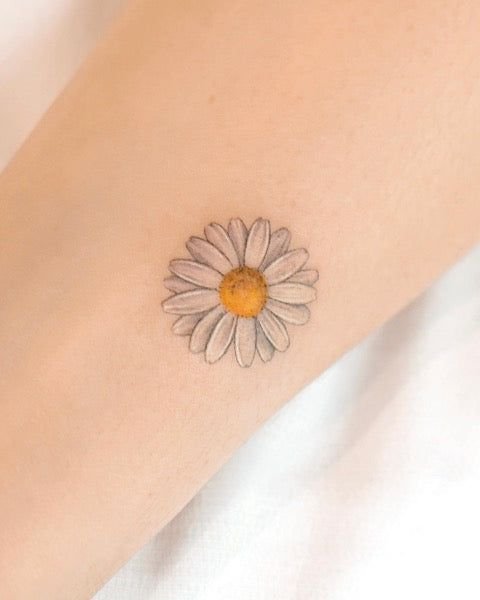 This style is perfect for those who prefer delicate and refined designs. A small daisy can be done in black and white or with subtle touches of color. These tattoos are often placed on the wrist, ankle, or behind the ear. - Realistic Daisy