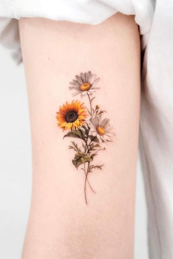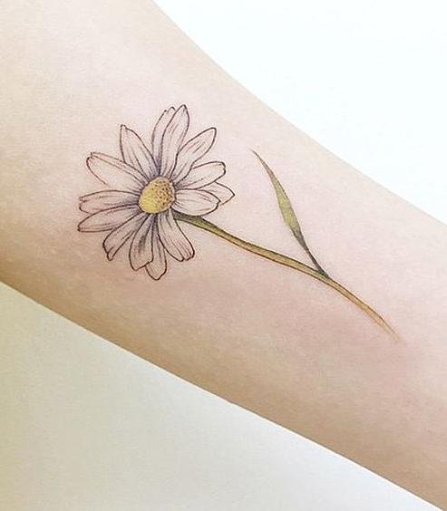If you want to add a splash of vibrancy, a colorful daisy tattoo is a great option. Bright yellow petals and a green stem create a lively image that brings the skin to life. Colorful daisies are often chosen by those who wish to express their positive energy and zest for life.