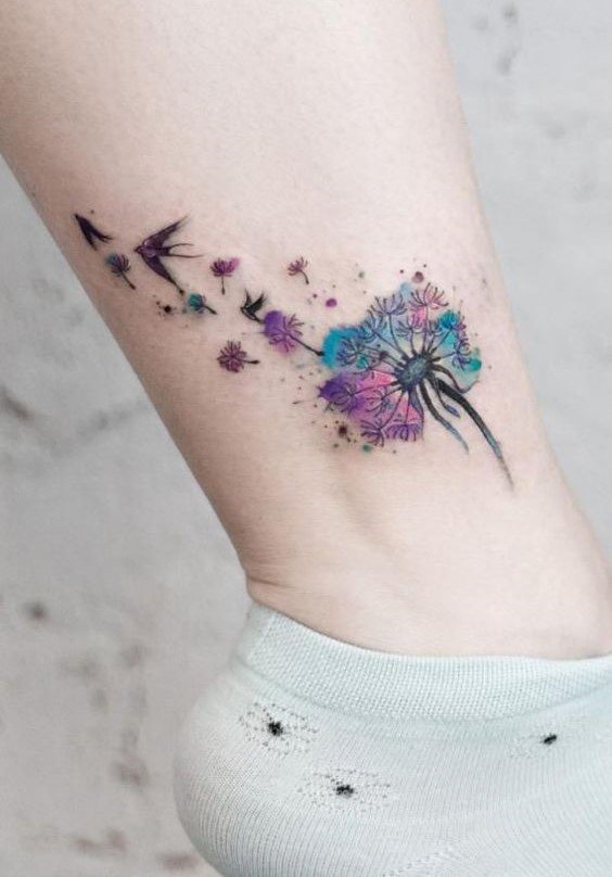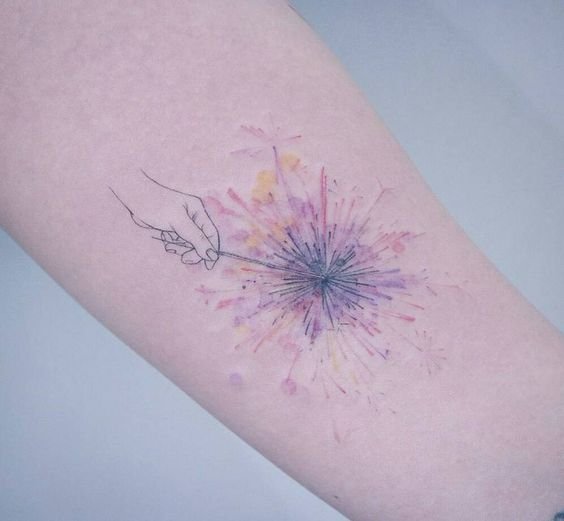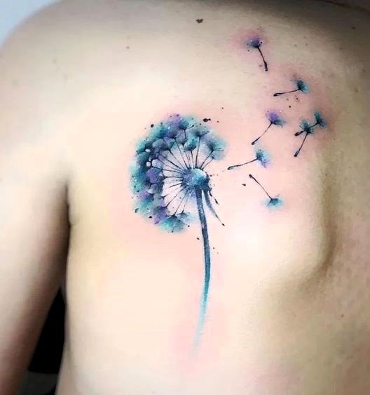 - Watercolor: The watercolor tattoo style adds lightness and airiness to the dandelion image, using smooth color transitions and mimicking the effect of watercolor paints.