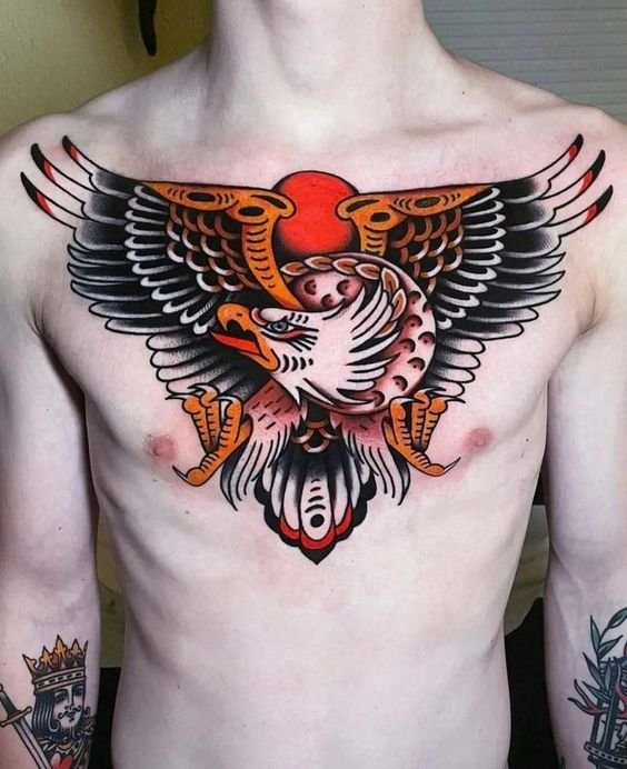 The traditional style, often associated with American traditional or "old school" tattoos, features clear outlines and a bright color palette. These tattoos are more stylized and iconic, often accompanied by classic attributes such as hearts, anchors, or ribbons with inscriptions. Traditional eagle tattoos symbolize not only strength and courage but also adherence to certain ideals and values.