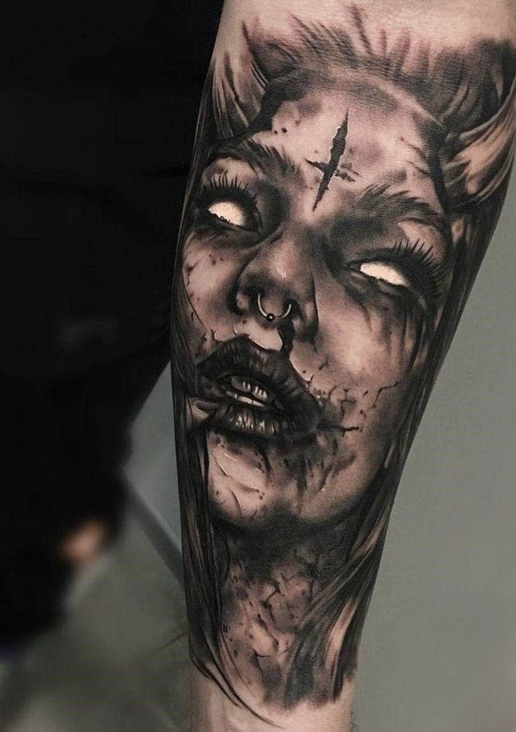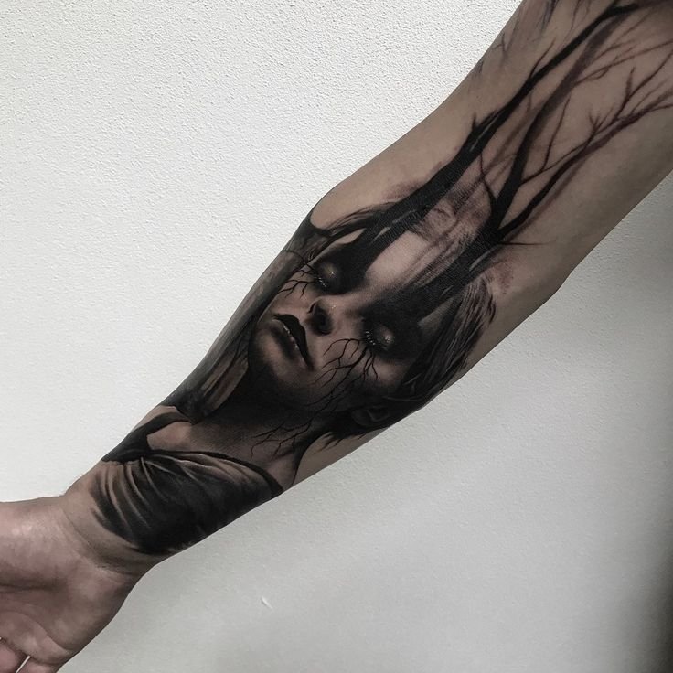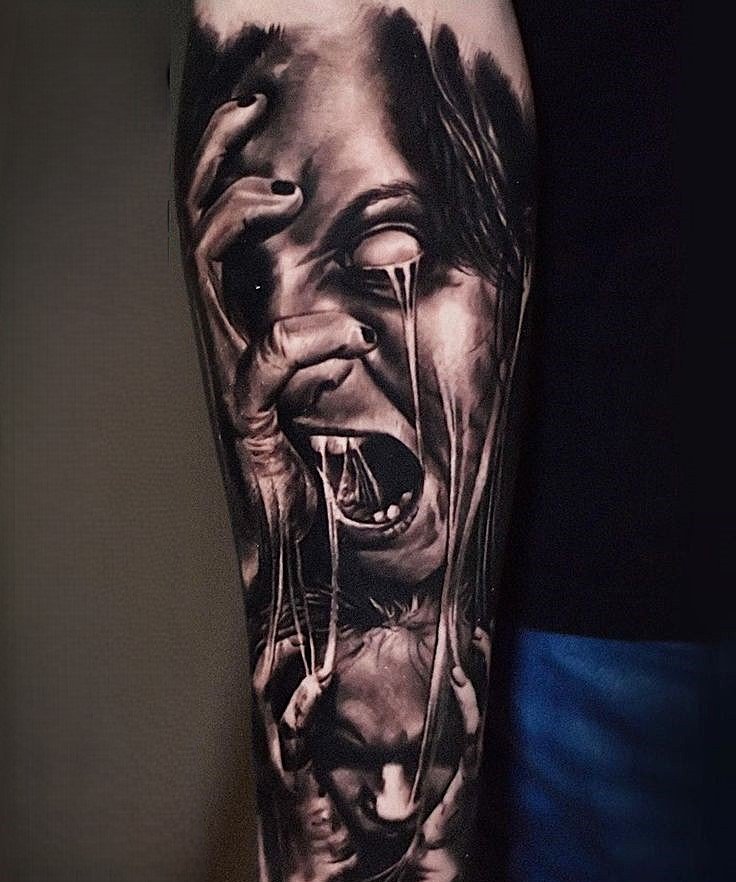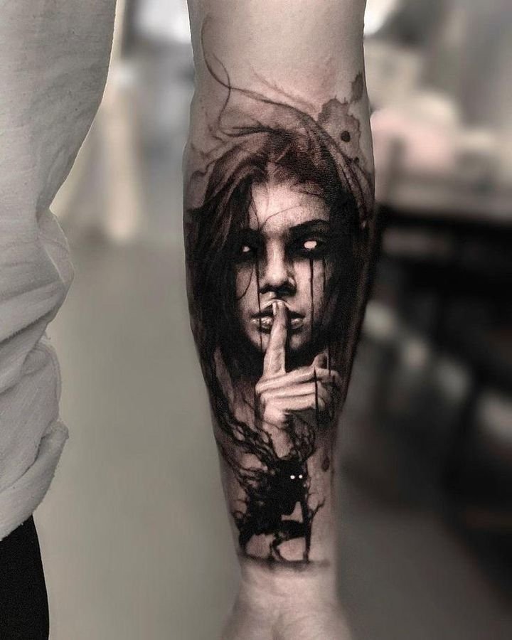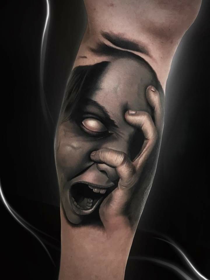 - Realism is a style where a ghost tattoo will appear as natural and detailed as possible. Such a design may use complex shading, semi-transparent elements, and fine lines to create the impression that the ghost is about to emerge from your body. Realism in ghost tattoos creates a deep, three-dimensional effect that makes the spirit almost "tangible." This style is perfect for those who want their tattoo to look almost like a photograph, full of details and realistic atmosphere.