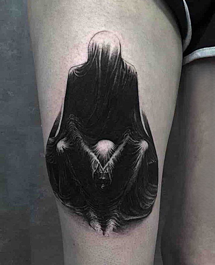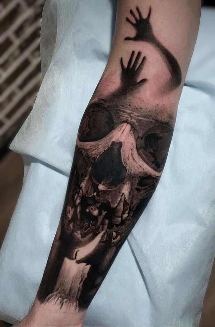 - The Gothic style adds an even deeper atmosphere to a ghost tattoo. It’s perfect for creating dark, gloomy images, where the ghost is depicted in the context of gothic architecture, skulls, candles, or mystical symbols. Such tattoos are often rich in intricate details that emphasize the gloominess, tragedy, and otherworldliness of the image. Gothic tattoos have a timeless, eternal darkness to them, making them an ideal fit for ghost tattoos.