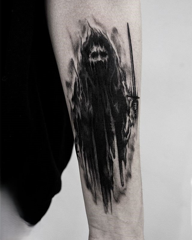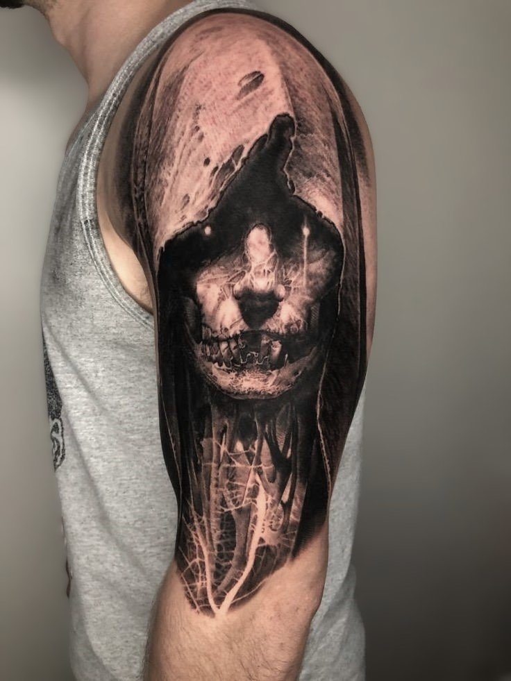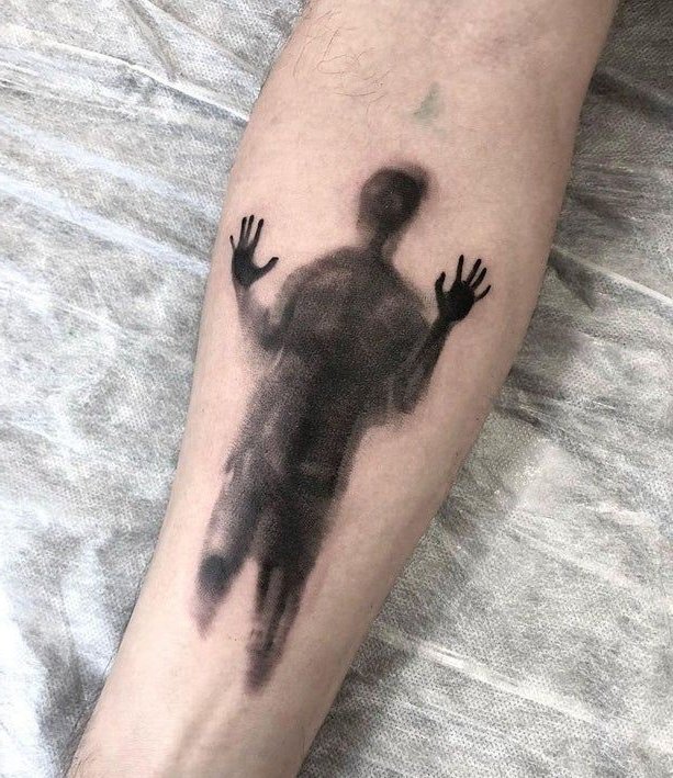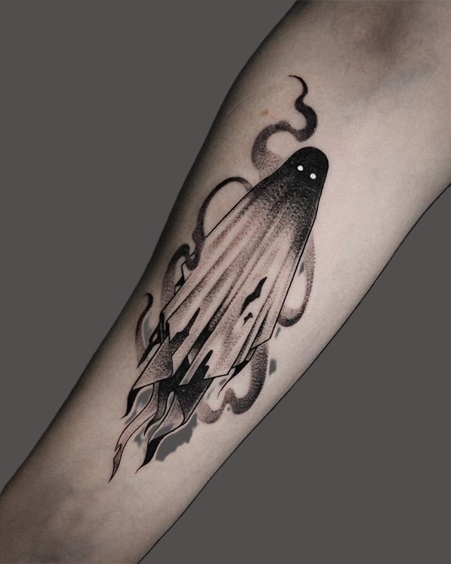 - One of the most popular options for ghost tattoos is the black and grey style. It’s ideal for creating an atmosphere of mystery and elusiveness. Tattoos in this style are often done in soft grey and black shades, where delicate transitions and shadows create the effect of a blurry, semi-transparent image. This approach conveys the ghost as a being caught between worlds, with its silhouette barely visible, dissolving into the air.