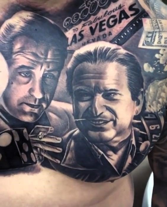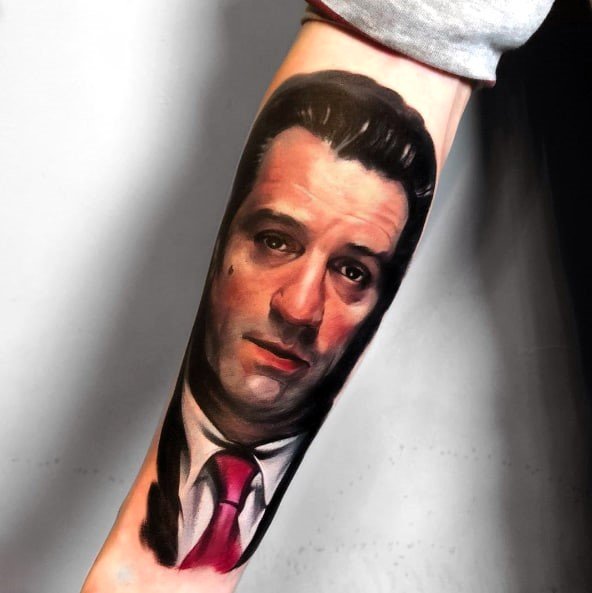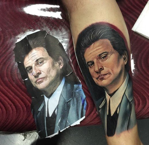 - Faces of the Main Characters One of the most obvious options is portraits of the main characters of the film. The face of Robert De Niro as Jimmy Conway or Ray Liotta as Henry Hill on your shoulder or chest would be a great choice for those who respect this film.