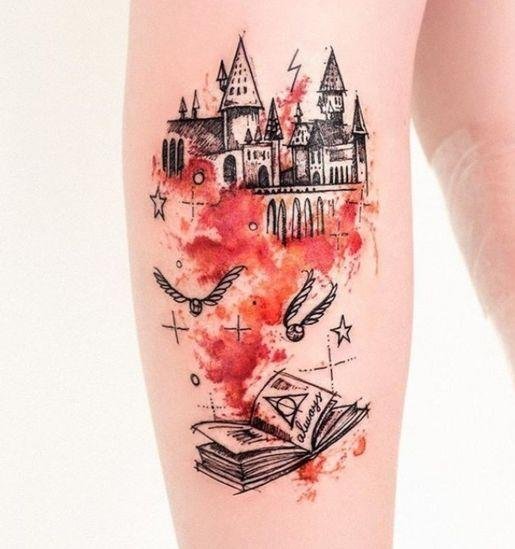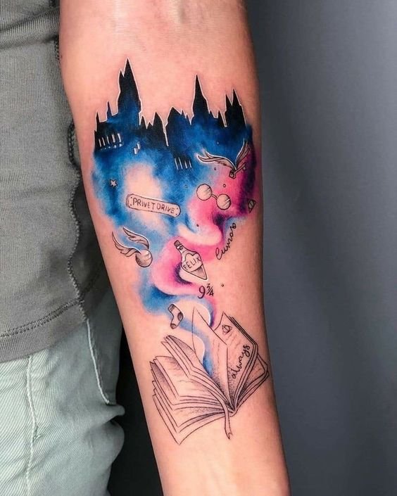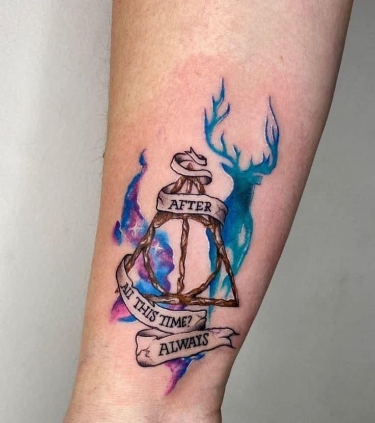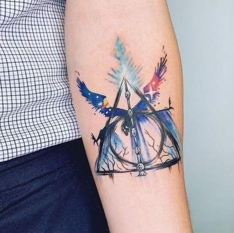 Harry Potter-inspired tattoos can be done in various styles, from minimalism and geometry to realism and watercolor.