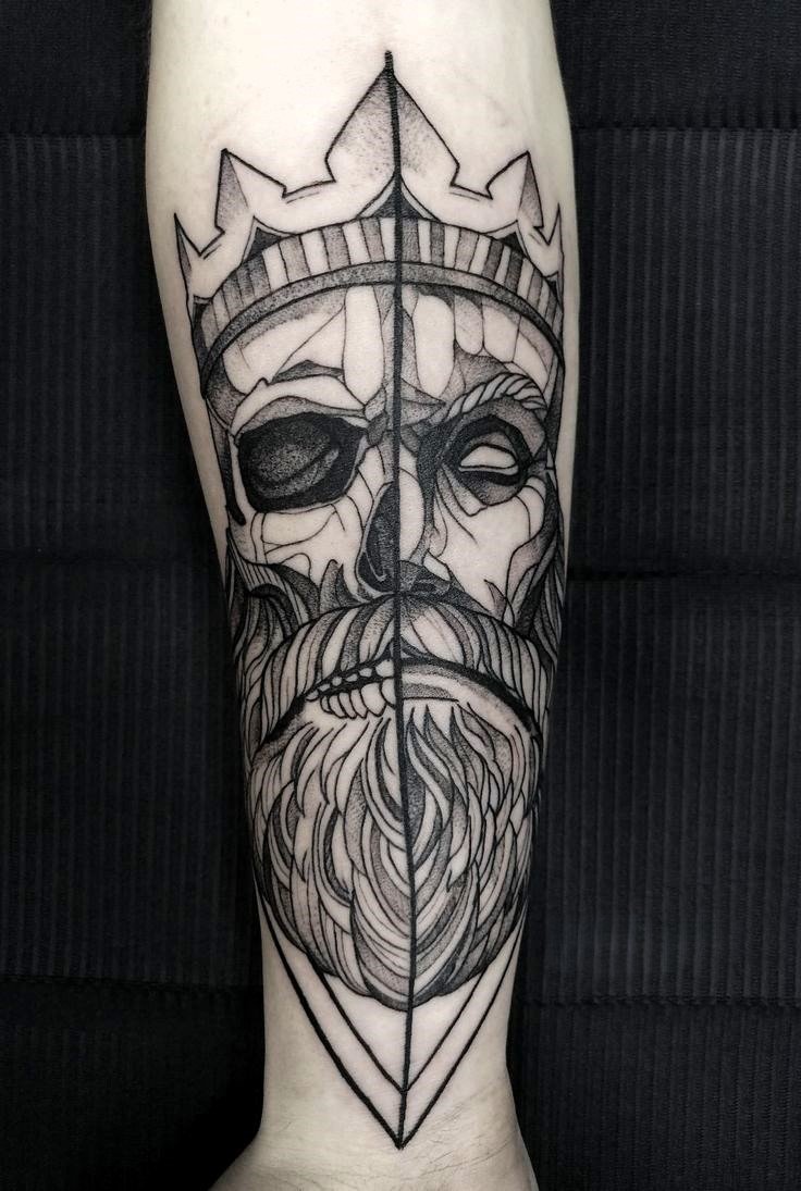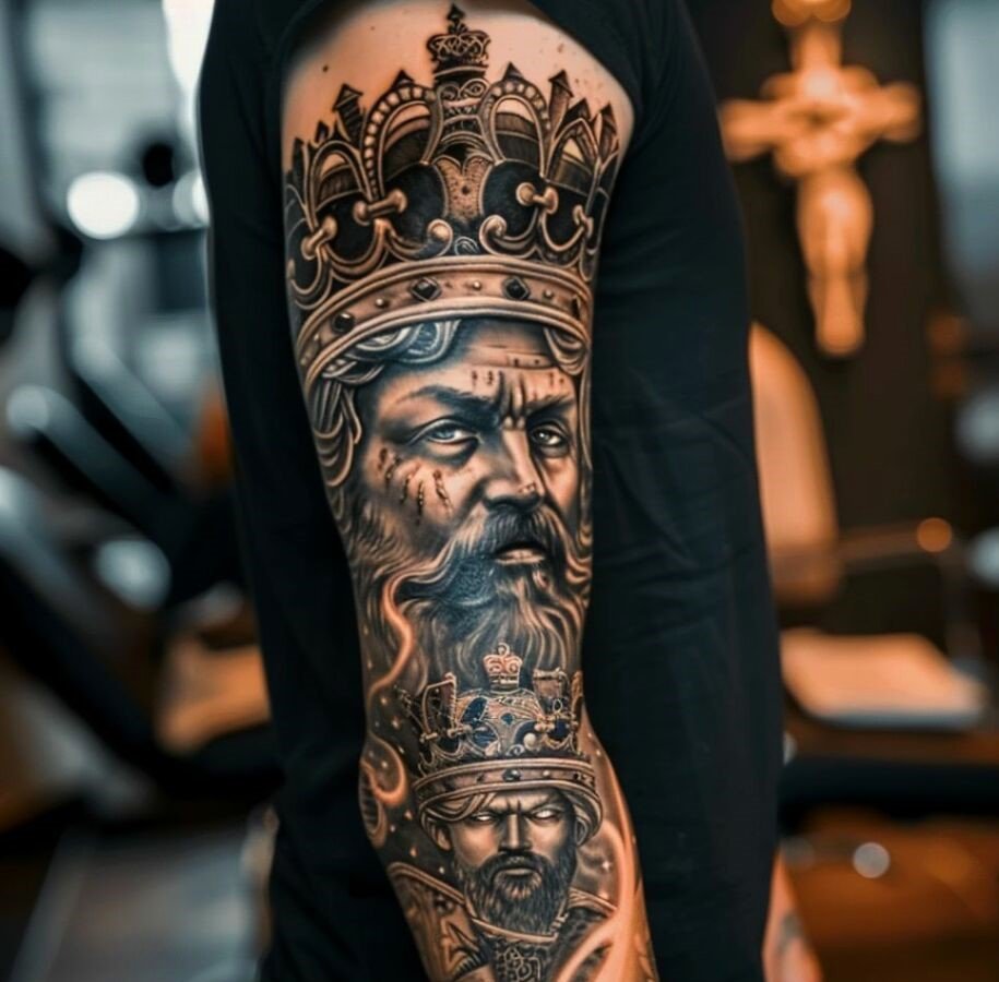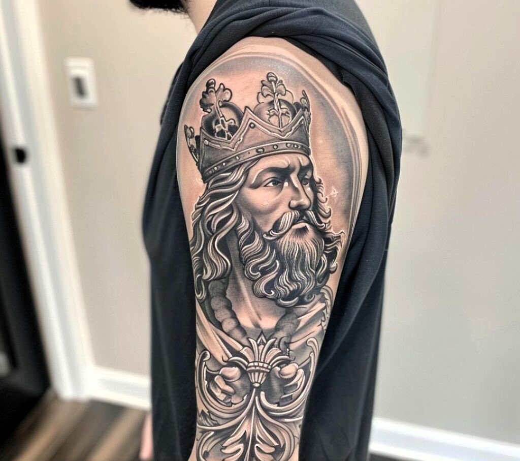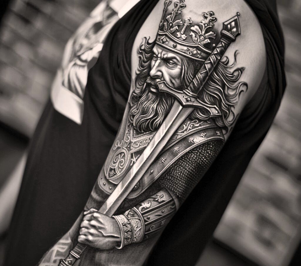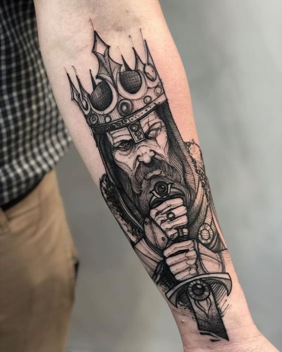 - Mythological Kings: Kings from myths and legends, such as King Arthur, emphasize the mystical and magical nature of authority. Such tattoos often carry a mystical undertone linked to magic and supernatural forces.