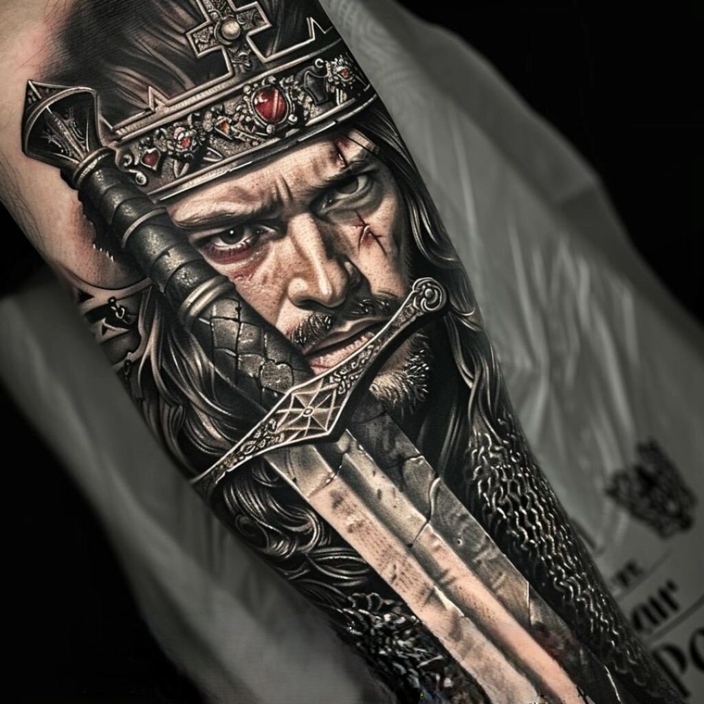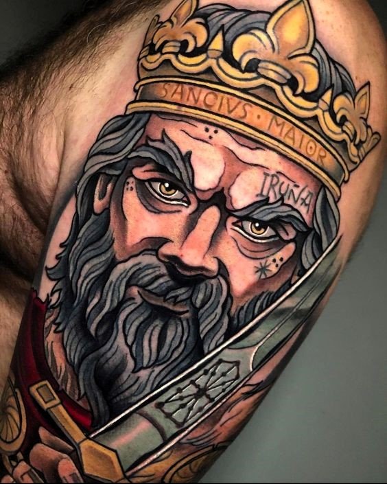 - Medieval Kings: Depictions of medieval monarchs, often with crowns and swords, are associated with chivalric honor, valor, and justice. This tattoo would appeal to those who appreciate classic symbols of strength and fairness.