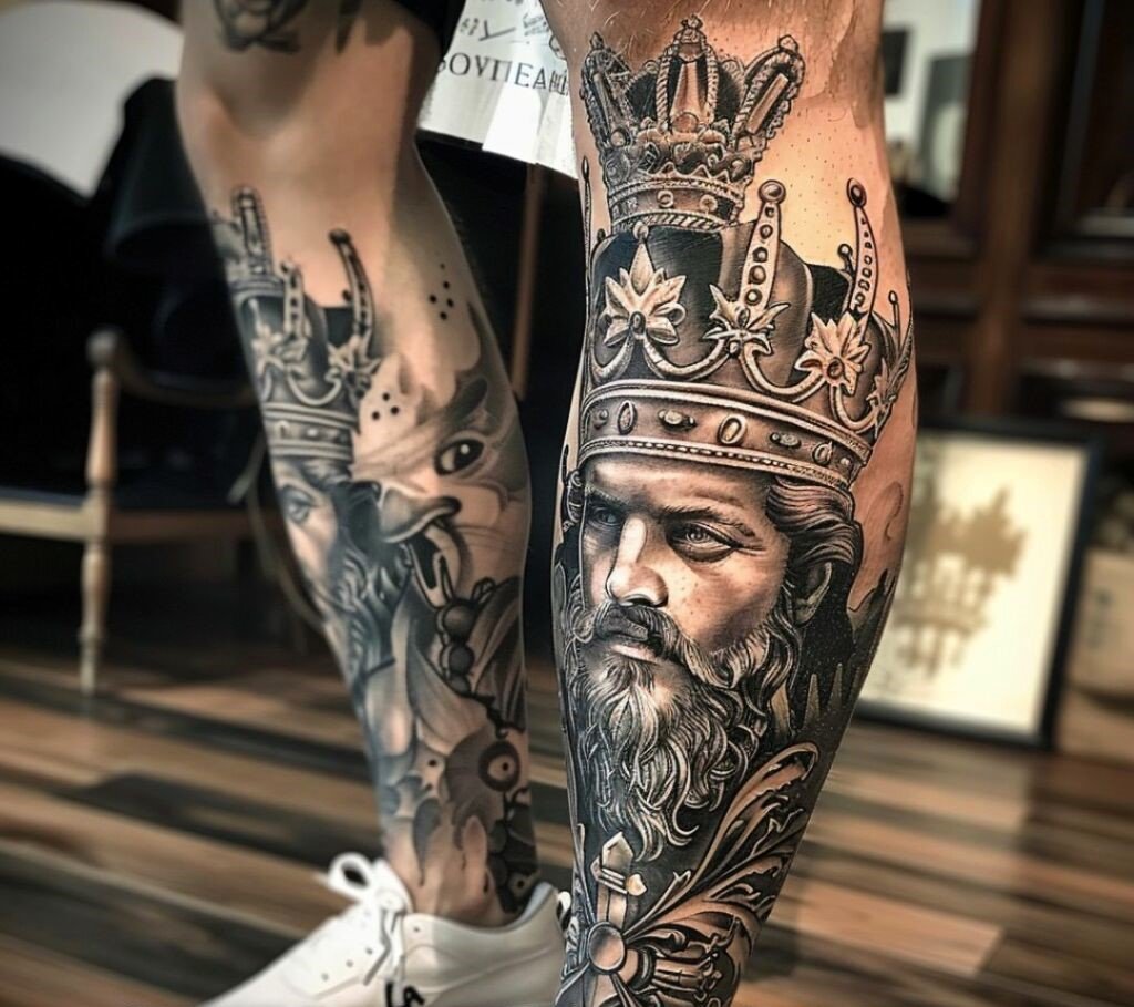 - King with a Crown: A classic image of a king wearing a crown is one of the most popular designs. The crown symbolizes supreme power, and this design highlights the tattoo owner’s desire for leadership and achieving great heights.