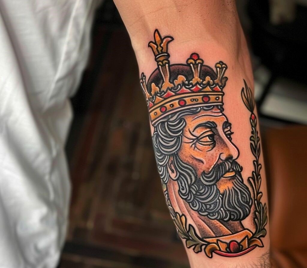 - Arm: The inner or outer part of the arm is a great place for a portrait of a king or royal symbol. Forearm tattoos, in particular, can be easily shown or concealed as needed.