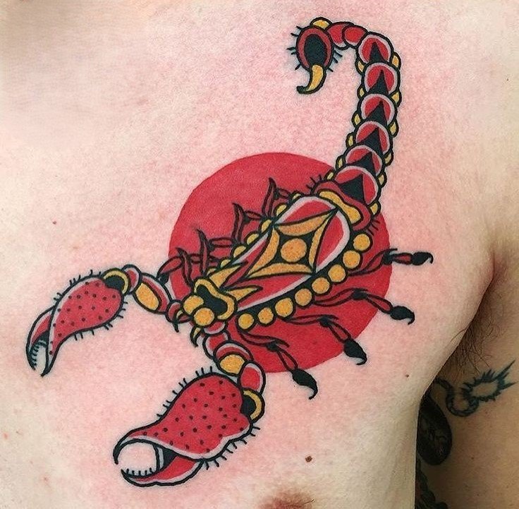 - Traditional Style: In the classic tattoo style, the scorpion can be depicted using bold black or red ink. Strong contrasts are often used, making the tattoo visually striking.