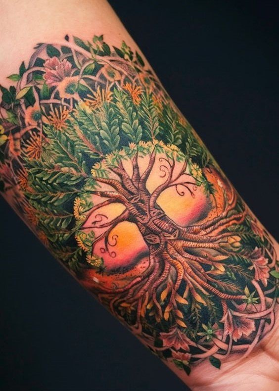 - In Norse legends, the Tree of Life is personified by Yggdrasil, an immense ash tree that interconnects the nine worlds of the cosmos. Its vast branches and roots are thought to uphold the very fabric of the universe. Yggdrasil symbolizes cosmic order, profound wisdom, and eternity. Beneath it lie three wells associated with destiny, knowledge, and the origins of existence. A tattoo depicting Yggdrasil can represent a deep comprehension of the universe, an unquenchable thirst for wisdom, and a connection to Norse heritage.