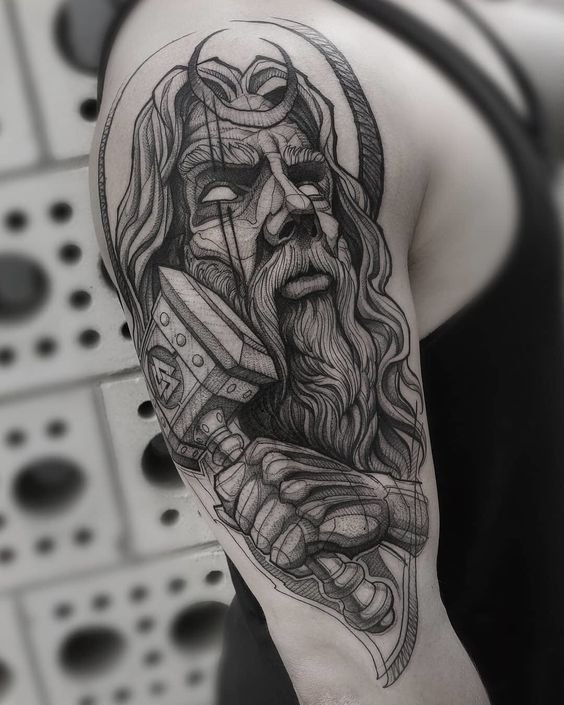 - Black and Grey Style: Excellent for Viking tattoos thanks to its ability to convey shadows, volume, and drama of scenes, making the image vivid and expressive.